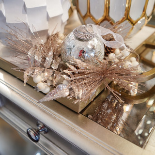For my coffee table decor...this year, I opted to balance out some of my gold accents and added in lots of shimmer, shine, and mirrored pieces through mercury and frosted mercury accents, as well as winter white florals.