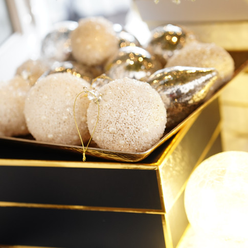And, because my friends over at Niche Modern Home love me so very much...we did our very first sponsored partnership this season, with Niche providing and sponsoring some of the holiday decor for my Master Bedroom, such as the following accents in the images below...all large and glittered sphere ornaments, gold Santa Claus, light-up Christmas Tree, white thistle shimmery Christmas Tree, gold shimmery Christmas Tree and the mercury, sparkled ornament.